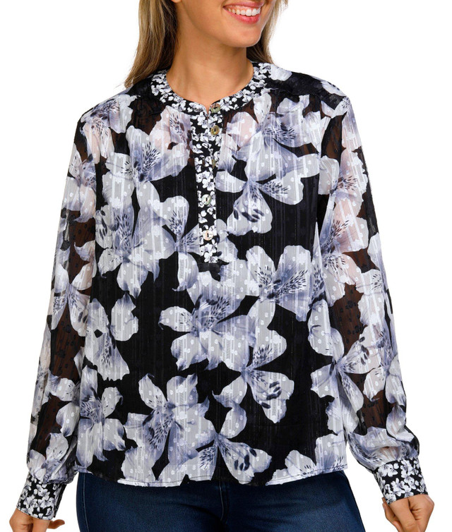 Light and graceful, the Womens Long Sleeve Floral Chiffon Top is made from 100% polyester with a breezy chiffon exterior. Featuring a delicate floral print, quarter button-down neckline, and flowing long sleeves, its perfect for layering or wearing solo for a soft, romantic look.