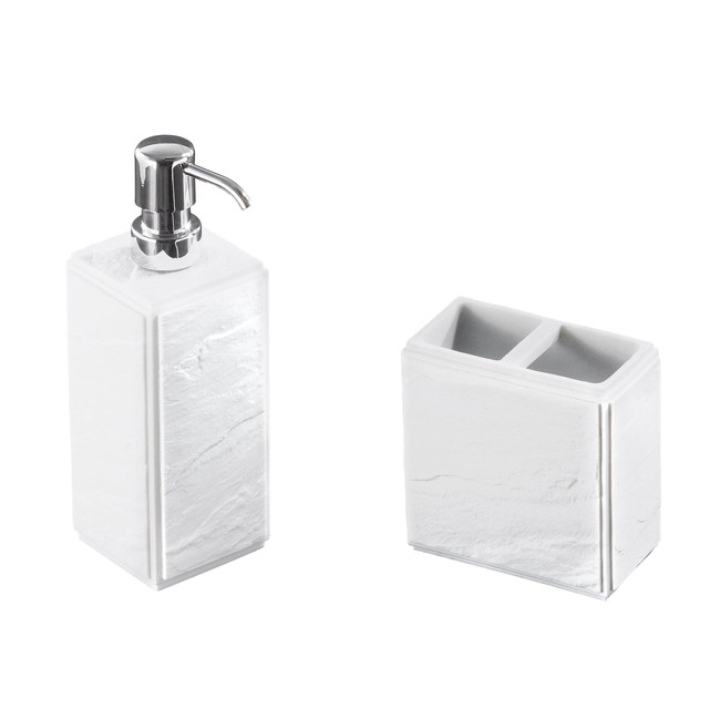 Enhance your bathroom with the Nicole Miller Zen 2-piece Decorative Toothbrush Holder and Lotion/Soap Dispenser Set. Featuring a modern, white textured design with raised panels on all sides, this set adds a touch of elegance and versatility to any space. Crafted from durable sand resin, it ensures easy care and a subtle sparkle, making it both stylish and practical. Toothbrush Holer (4.30 x 2.20 x 4.30) Lotion Pump (3.00 x 3.00 x 8.36).