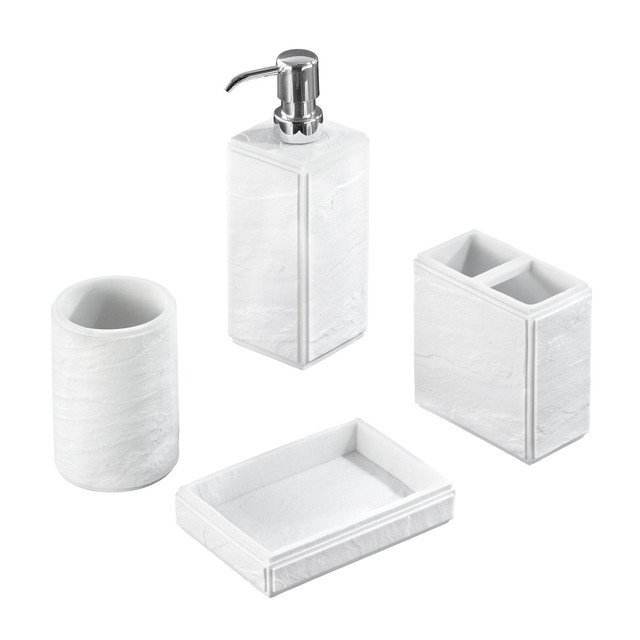 Elevate your bathroom decor with the Nicole Miller Zen 4-Piece Decorative Accessory Set. This modern collection features a white, textured marble design with raised panels on all sides, adding a touch of elegance and sparkle. Crafted from durable sand resin, these accessories are easy to care for and built to last. The et includes a tumbler (3.00 x 3.00 x 4.30), toothbrush holder (4.30 x 2.20 x 4.30), soap dish (5.50 x 4.00 x 1.10), and lotion dispenser (3.00 x 3.00 x 8.36).