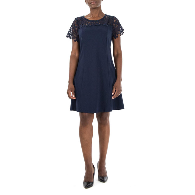 This Nina Leonard dress exudes elegance with lace cap sleeves and a beautifully embroidered novelty yoke. Its A-line silhouette and princess seams flatter the figure, offering a graceful, polished look. Perfect for special occasions, it blends timeless charm with intricate detail. Dress Hem Length 37.5 in.