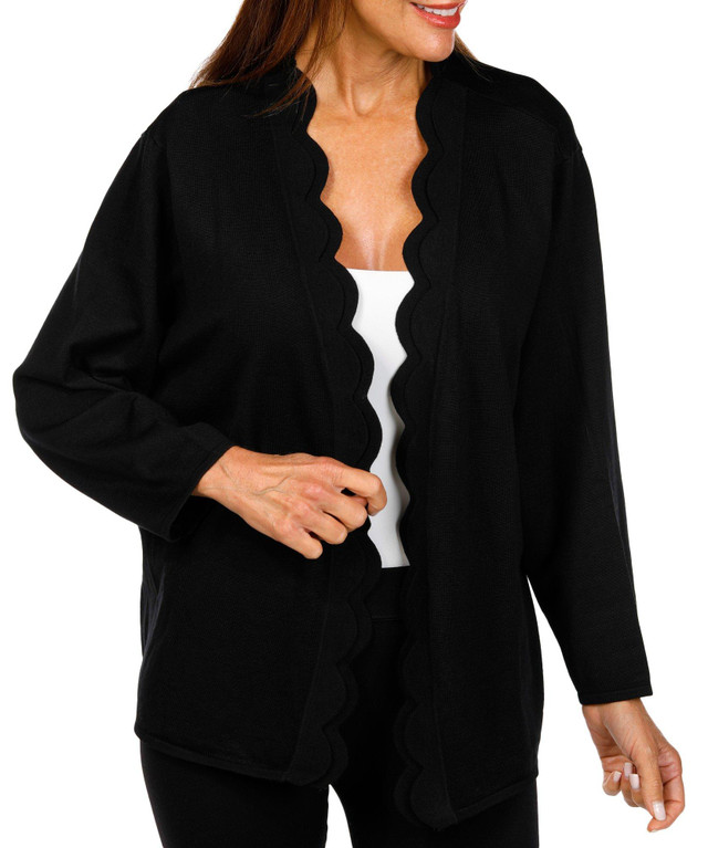Complete your style collection with this elegant Long Sleeve Bolero Shrug, featuring a delicate scalloped trim that adds a touch of sophistication. Perfect for layering over dresses or tops, this shrug offers a refined and stylish element to any outfit. The long sleeves provide extra coverage, making it ideal for cooler days. Embrace the blend of elegance and versatility with this beautifully crafted piece. Fabrication is 78% rayon, 22% polyester.