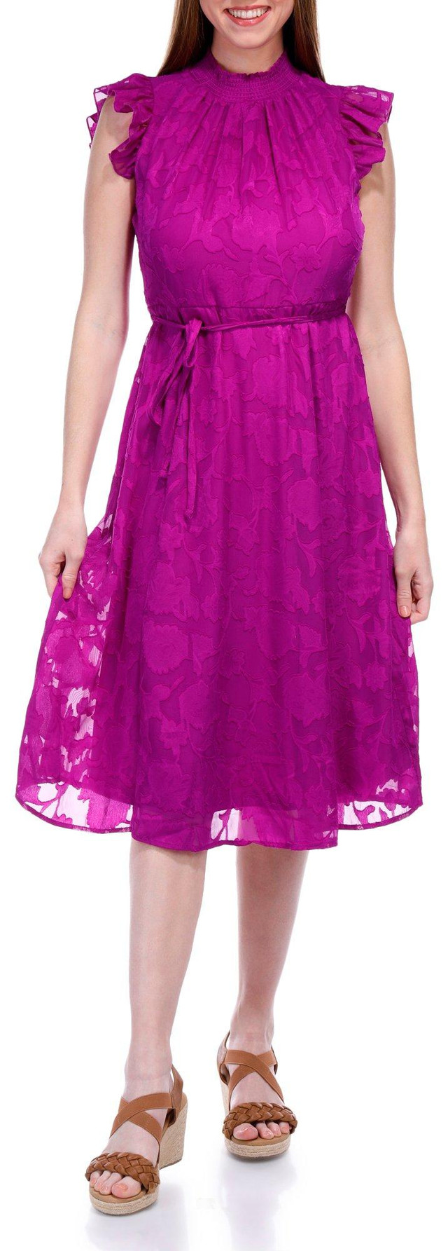 Introducing the Women's Short Sleeve Textured Midi Dress, crafted from 100% polyester. This elegant dress features a solid, textured exterior, short ruffle sleeves, and a high neckline. With a 45-inch length, it offers a sophisticated and stylish look. Perfect for any occasion, this dress combines beauty and comfort, making it a must-have addition to your wardrobe.