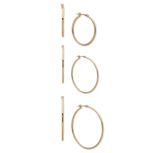 The 3-pc. Hoop with Earring Set features three pairs of stylish hoops in 28MM,34MM,and 44MM sizes. Crafted for versatility, this set offers the perfect hoop style for any occasion, adding a touch of elegance and sophistication to your look.
