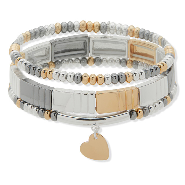 Add charm to your stack with the 3-Row Heart Charm Stretch Bracelet. Featuring three rows of mixed metals, a heart charm, and a comfortable stretch fit, it is a sweet and stylish piece for everyday wear.