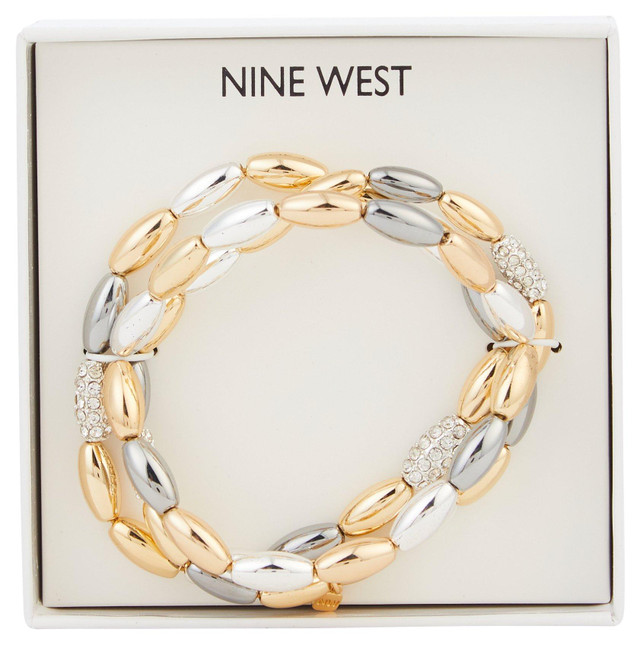 Elevate your wristwear with the Three Row Tri Tone Stretch Beaded Bracelet Set. Featuring tri tone long beads accented by scattered pave rhinestone covered beads, this stackable set offers a sophisticated blend of shimmer and color. Ideal for adding refined sparkle to both casual and formal looks. Beautifully packaged in an elegant box, perfect for gifting. Bracelets have an inner diameter of 2.25 in.