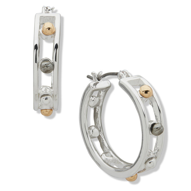 These Nine West hoop earrings are perfect for everyday wear. Featuring rhinestone embellished slide rings, click top closure & has a silver, hematite & gold tone finish.
