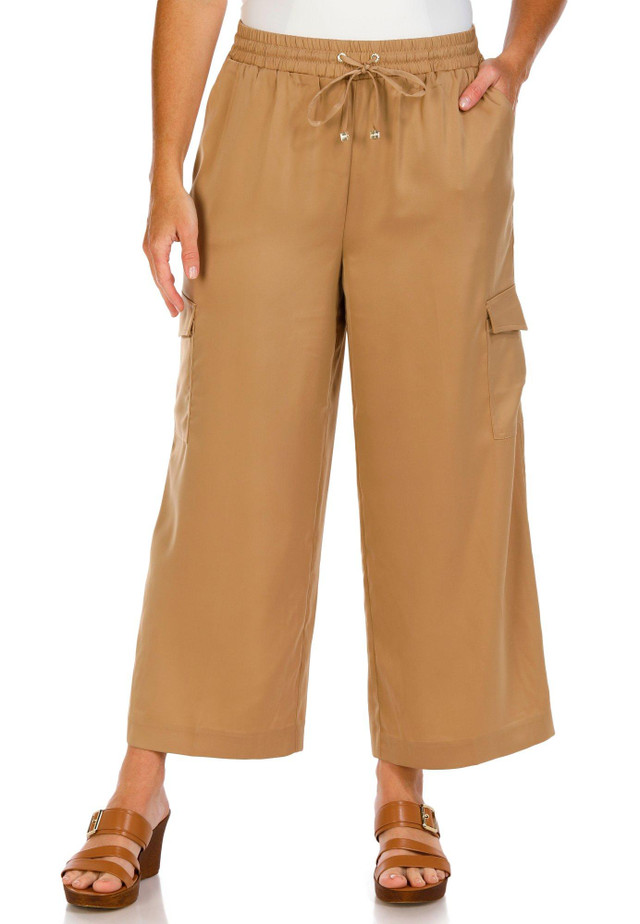 Chic and comfortable, the Women's 25 in Pull-On Satin Wide Leg Crop Pants feature a solid color, wide leg fit, and cropped length. Designed with a drawstring elastic waistband, side seam and cargo pockets, they blend utility with a soft, satin finish for effortless style. Fabrication 97% polyester, 3% elastane