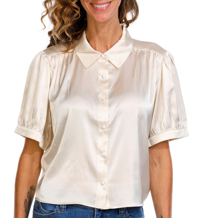 Add a touch of polish with this Women's Short Sleeve Satin Button Down Top. Designed in a sleek solid satin fabric, it features a classic collared neckline, button-down front, and playful bubble short sleeves. Perfect for dressing up or down with ease. Fabrication 97% polyester, 3% elastane