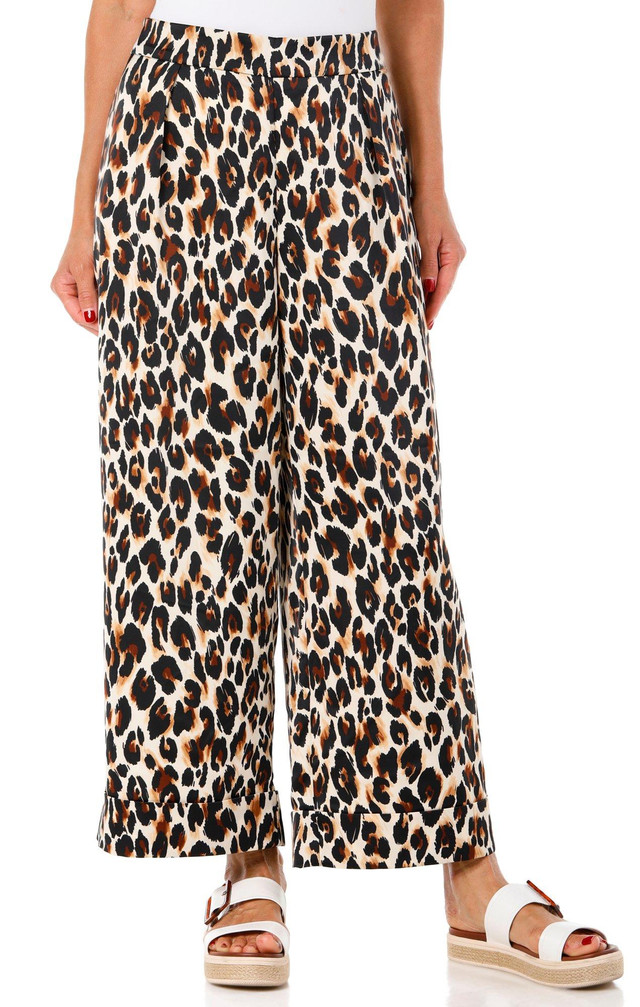 Make a bold statement in our Women's Wide Leg Leopard Print Pants. Featuring a fierce leopard print, elastic waistband, and a breezy wide-leg fit with a 25.5-inch inseam, these pants blend comfort and standout style for effortless day-to-night wear. Fabrication 97% polyester, 3% elastane