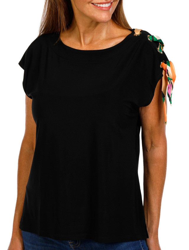 Modern style meets versatility in a womens solid cap sleeve top featuring lace-up shoulder detail for a chic, elevated touch. Easy to dress up or down, it transitions effortlessly from workdays to nights out with friends. Measures approximately 25 in. Fabrication is 96% polyester, 4% elastane.