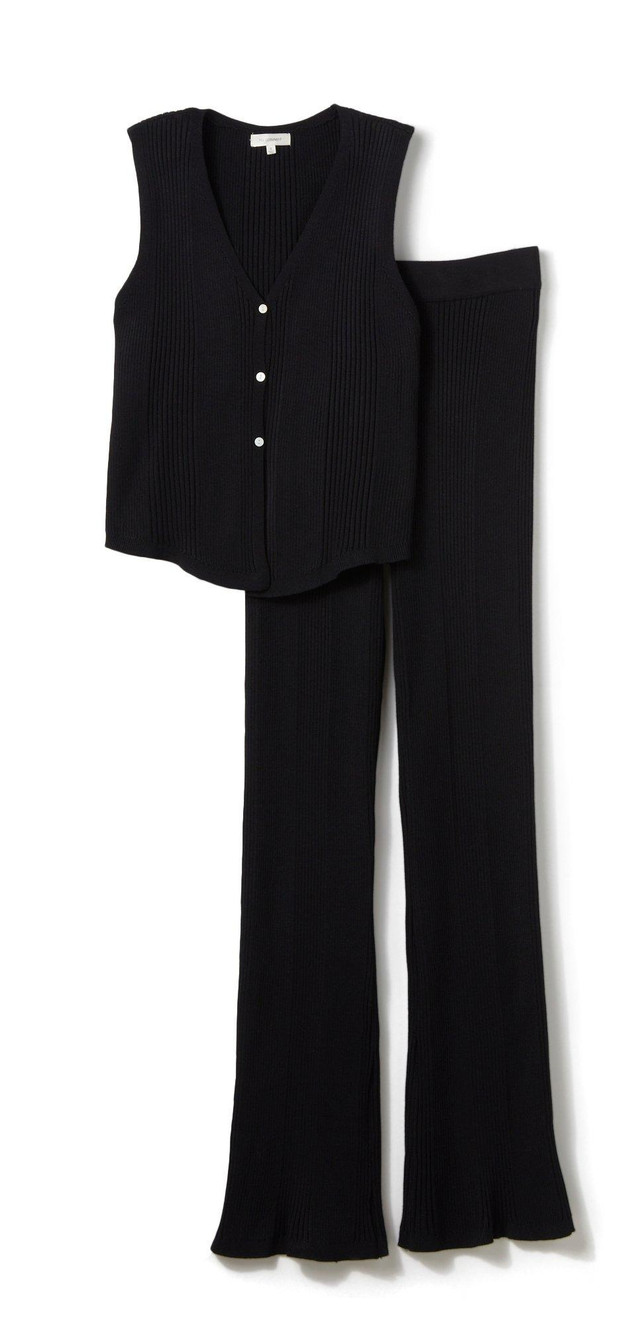 This juniors 2 piece jumpsuit features a sleeveless rib vest with button down detail and pull on long pants. Designed for comfort and coordinated style perfect for casual wear or dressed up looks. Fabrication is 78% rayon and 22% polyester.