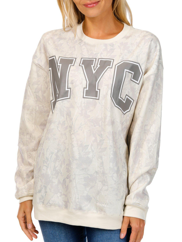 Stay cozy and stylish in this Juniors Long Sleeve NYC Camo Pullover. Featuring a bold camo print and NYC script scene on the front, its designed with a soft inner fleece lining, crew neckline, and long sleeves for all-day comfort and urban flair.