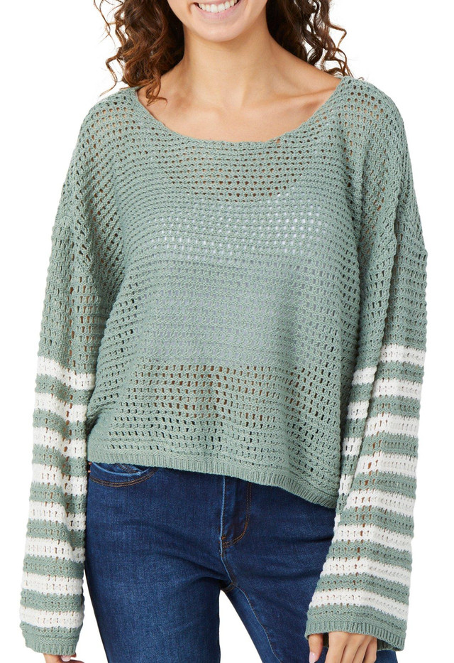 Stay effortlessly chic in this Long Sleeve Sweater, crafted from open weave fabric for a breathable, textured feel. Striped sleeve accents add a sporty twist, while the boat neck lends a touch of elegance. Perfect for layering or wearing solo, its a versatile piece with laid-back charm. Top length measures approximately 20 in.