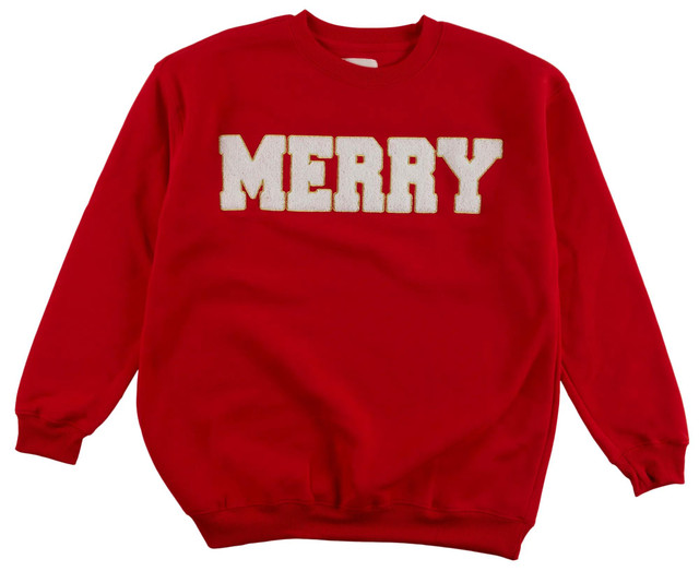 Spread holiday cheer with the Juniors Merry Patch Sweater, featuring bold patch lettering that spells out Merry across the front. Designed with a classic crew neck and a soft fleece inner lining, it offers cozy comfort with festive flair Body Fabrication 100% polyester. Rib Fabrication 95% polyester, 5% spandex
