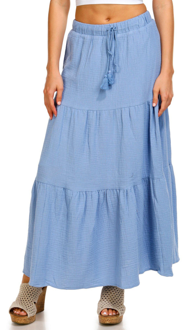 Add a touch of charm to your wardrobe with the Juniors Tiered Maxi Skirt. Made from 100% polyester, this skirt features a delightful design and a drawstring, elastic waistband for a perfect fit. Look effortlessly stylish from the beach to the boulevard in this versatile piece. Toss over your fav swimsuit or dress up for a night out.