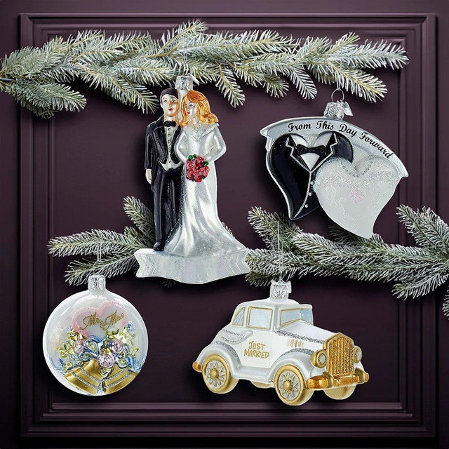Celebrate love with the Kurt Adler Noble Gems Wedding Ornament Set! This elegant boxed set features four glitter-accented icons: bride, groom, Just Married car, golden bells, and heartfelt vows. Perfect for gifting newlyweds, these keepsake ornaments add charm and sentiment to holiday décor, making every Christmas a reminder of their special day. Each measure 8.87 in. x 10.84 in. x 5 in.