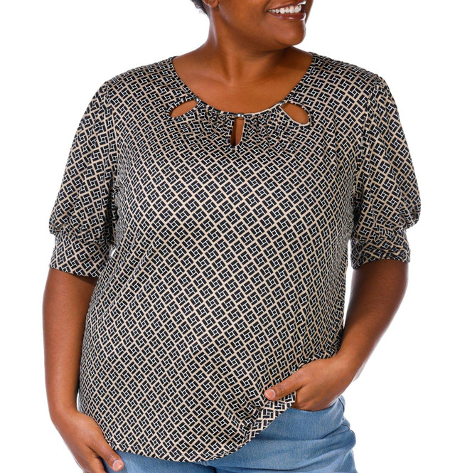 This soft stretchy top features three keyhole designs around the neckline and banded mid-length sleeves. It offers a flattering fit with a smooth texture. The modern details add style to both casual and dressy outfits. Fabrication is 95% polyester and 5% spandex.