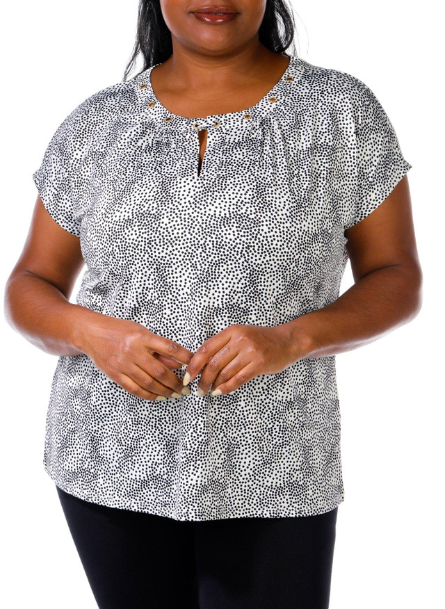 This Short Sleeve Top stands out with its sleek print and eye catching metal grommet embellishments. Made from soft, stretchy fabric, it offers a comfortable fit with a touch of edge. Perfect for adding bold style to your everyday look. Fabrication is 95% polyester, 5% spandex.