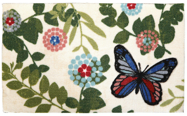 Introducing the butterfy print Accent Rug, a vibrant addition to any room. This stunning rug features a colorful print that brings a touch of botanical charm to your home. Its non-skid backing ensures it stays securely in place, providing both beauty and safety. Measures 18 in x 30 in.