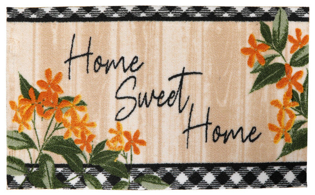 Introducing the Home Sweet Home print Accent Rug, a vibrant addition to any room. This stunning rug features a colorful print that brings a touch of botanical charm to your home. Its non-skid backing ensures it stays securely in place, providing both beauty and safety. Measures 18 in x 30 in.
