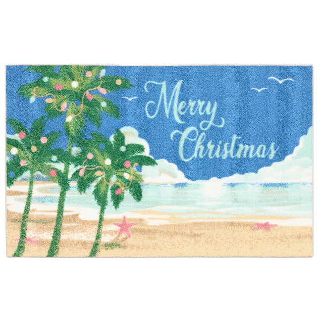This holiday accent rug features a beach scene with palm trees and Merry Christmas script, with non-skid backing. It brings festive coastal charm and cheerful holiday spirit to any space. Fabrication is 100% polyester.