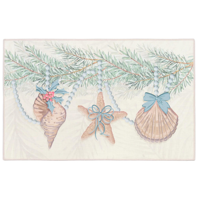 Celebrate the season with coastal flair using this 20x32 inch Shell Garland Holiday Accent Rug. Featuring a festive garland of seashells, it blends beachy charm with holiday spirit.