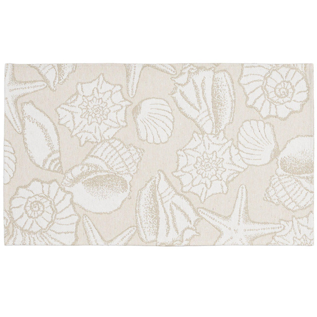 Nourison offers the world's best carpets, rugs, and floor coverings! This rug will add a chic accent to any space in your home. It features seashells pattern. Fabrication is 71% Polyester, 23% Cotton, and 6% other fabric. Measures 27 in x 45 in.