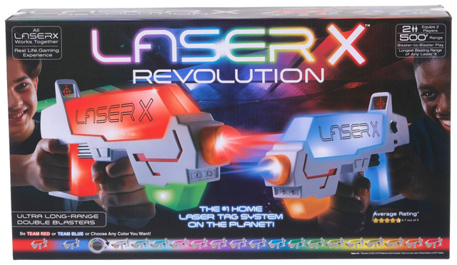 Bring action packed play to life with the 2 Pack Laser X Revolution Long Range Laser Tag Set featuring double blasters that fire an invisible infrared beam with a range of up to 500 feet. Equips two players for competitive outdoor or indoor fun. Requires 6 AAA batteries (not included). Recommended for ages 6 years and up.