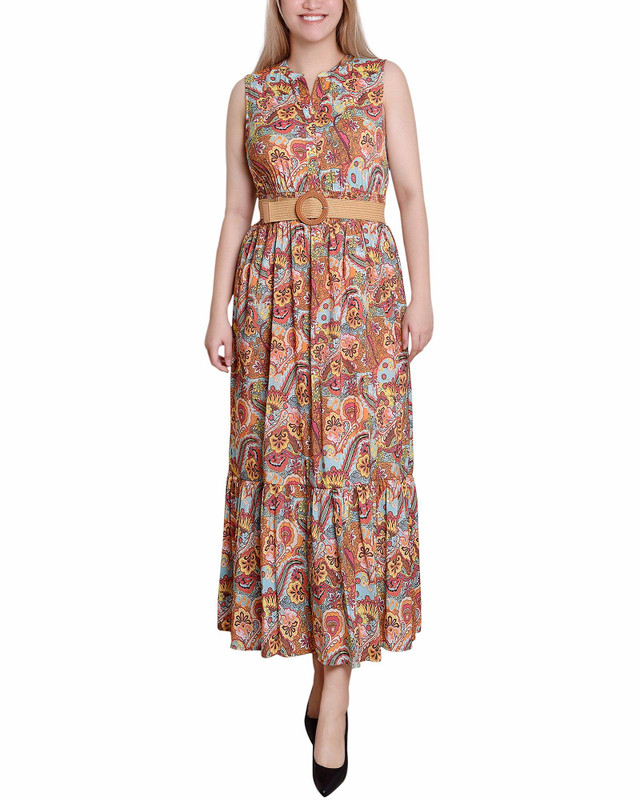 Elevate your style with this sophisticated midi dress, featuring a tiered design and a belted waist for a flattering silhouette. The sleeveless cut and notch neck adds a modern touch, while the floral paisley design in colorful crinkle rayon blend fabric brings vibrant elegance. Perfect for both work and special events, this dress effortlessly combines comfort and sophistication, making it a versatile addition to your wardrobe. Length 50 in. Fabrication 62% rayon, 38% polyester.