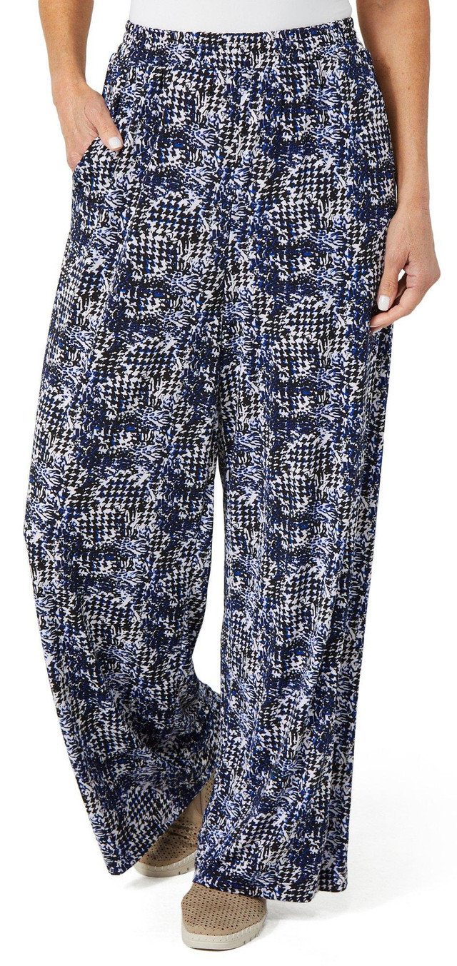 These petite stretchy pants feature a printed pattern and side seam pockets for everyday function. Designed for comfort and style, they offer a sleek silhouette perfect for casual wear. Inseam is approximately 30 in. Fabrication is 95% polyester and 5% spandex.