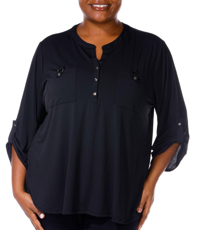 NY Collection has updated this classic silhouette by adding shoulder epaulettes and box pleated pockets. Fabrication is 95% polyester, 5% spandex.