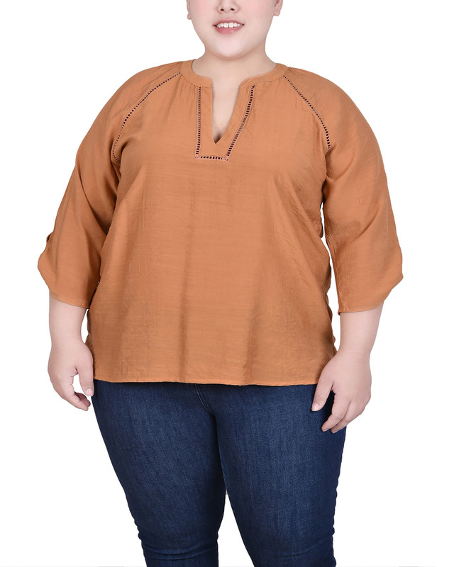 NY Collection Plus 3/4 Sleeve Roll Tab Y Neck Blouse