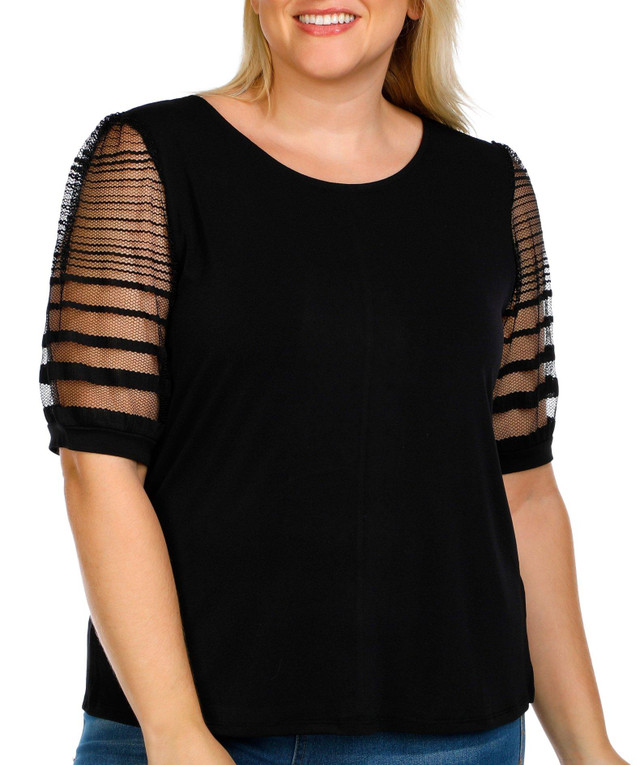 This Plus Sheer Short Sleeve Crepe Top features a solid color with a round neckline and sheer sleeves for a light, elegant touch. Its polished design makes it a versatile and stylish choice for the workday.