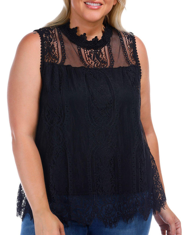Stand out in a crowd this holiday with this Plus Sleeveless Lace Tank Top. Pair with a velvet pant or skirt for a perfectly put together look this season. Fabrication is Self: 100% Nylon, Lining: 100% Polyester. Top length measures approximately 27 in.