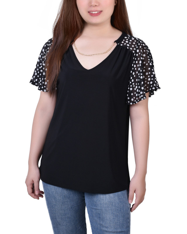 This top from NY Collection is all about the drama. Combo printed shoulder and chiffon sleeves make this top a real-eye catcher..