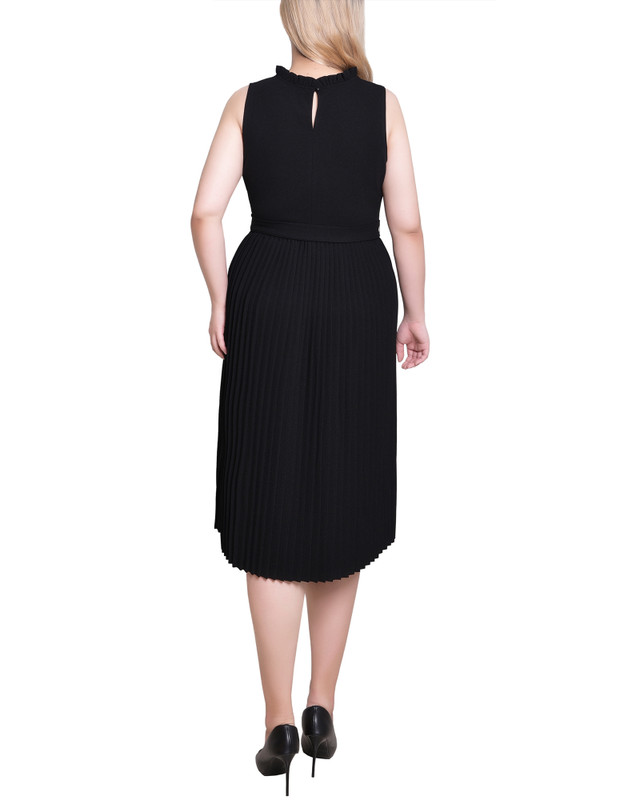 Make a bold statement in this NY Collection sleeveless crepe dress. Featuring a vibrant color, soft chiffon fabric, and a flattering elastic waistband with a tie belt, its designed to turn heads. The pleated skirt and ruffle neckline add a feminine flair, perfect for day-to-night wear. Dress length approximately 38 in.