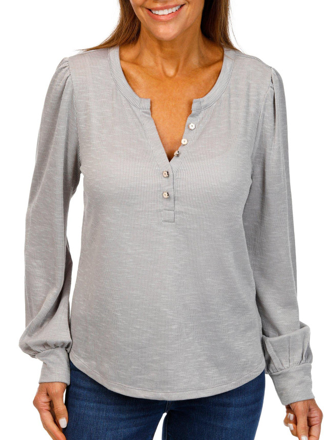 This womens long sleeve top is made from soft fabric and designed in a ribbed henley style, featuring a button-down collar and a solid color. Fabrication is 75% polyester, 21% rayon, and 4% spandex.