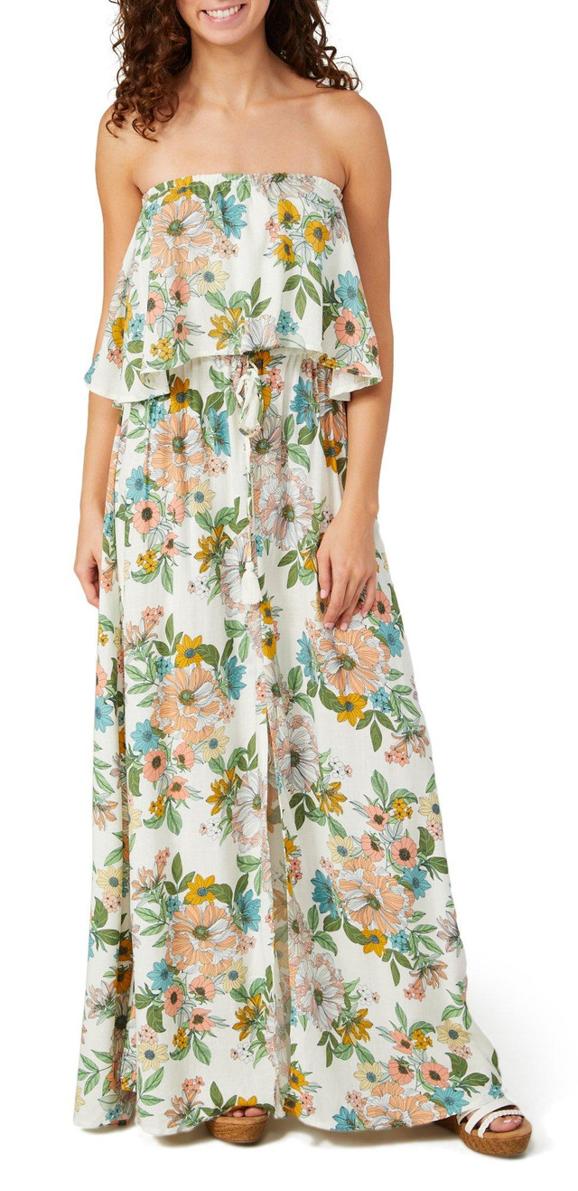 This flowy strapless maxi dress features a colorful floral print, front slit detail, and elastic waist with adjustable drawstring. Measures 50 inches from center front to hem. Fabrication 100% viscose
