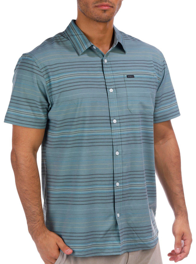 Stay sharp and sun-ready in the Men's Traverse Stripe Button Down Shirt. Made from a performance blend of polyester, cotton, and elastane, it features a striped print, button-down front, collared neckline, short sleeves, and a chest slip pocket. With UPF 50+ sun protection, stretch, and moisture-wicking fabric, its built for comfort and style on the move.