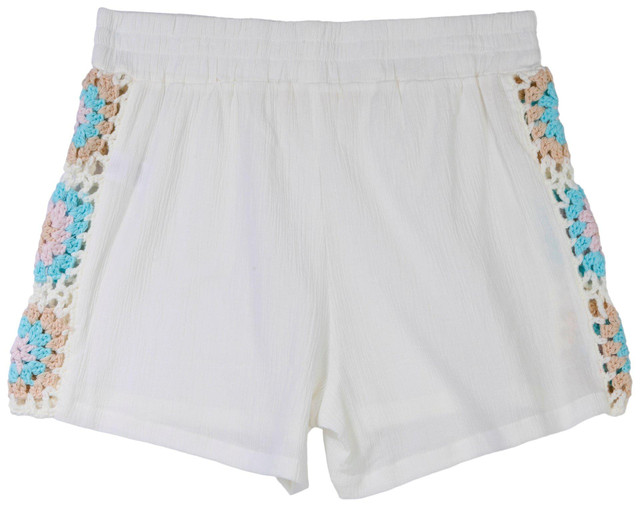 Breeze through your day in the Juniors Crochet Shorts. Featuring a stylish crochet design along the sides, side seam pockets, and a comfy elastic waistband, these shorts blend boho charm with everyday comfort. Fabrication 100% cotton