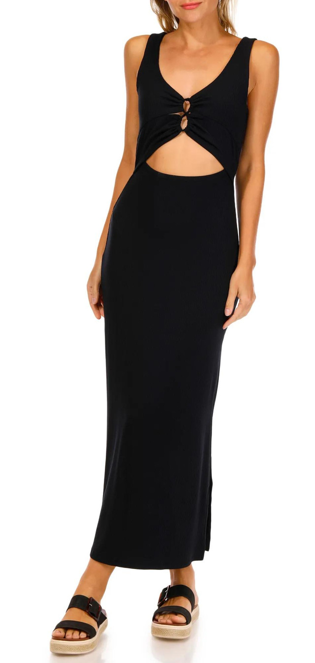This juniors sleeveless maxi dress features a solid color, v-neckline, side slit hem, ribbed texture, and a stylish cutout at the midsection. With its flattering fit and breezy length, it is perfect for warm days when you want to stand out with effortless style. Fabrication 92% rayon, 8% spandex