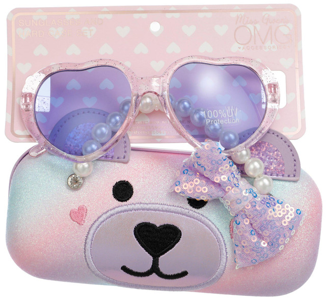 Add a touch of fun and protection to your sunny days with the Girls 2 Pc Sunglasses Set. This adorable set includes a pair of heart-shaped sunglasses that offer 100% UV protection, ensuring your eyes stay safe from harmful rays. The set also features a glittery bear-shaped glasses case with handles, perfect for keeping your sunglasses secure and stylish.