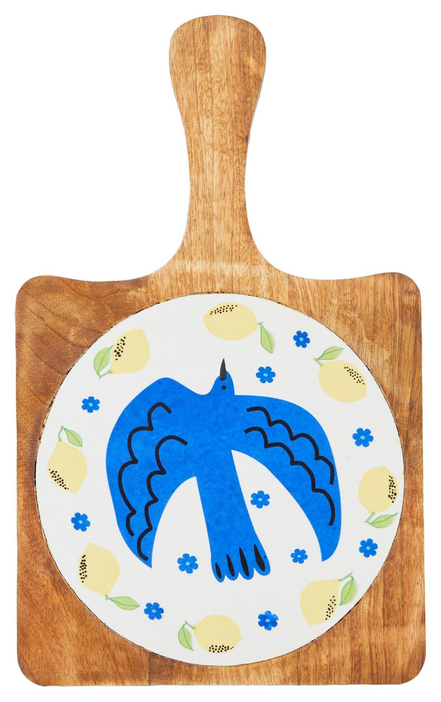 Enhance your kitchen with the 18 in Wood Ceramic Cutting Board. Featuring a ceramic inlay adorned with flowers, lemons and a prominent blue bird, it combines artistry with function. Crafted from 100% wood with a decorative 100% ceramic inlay. Hand wash only to preserve the design. Measures approximately 18 in x 11 in.