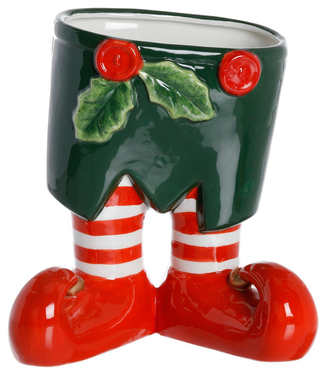 Add playful charm to holiday decor with the Elf Pants Ceramic Planter. Shaped like festive elf pants, this ceramic piece is perfect for holding seasonal greenery or decorative accents. A whimsical addition to tabletops or mantels. Fabrication is 100% ceramic. Measures approximately 8.5 in x 8.5 in x 5 in.