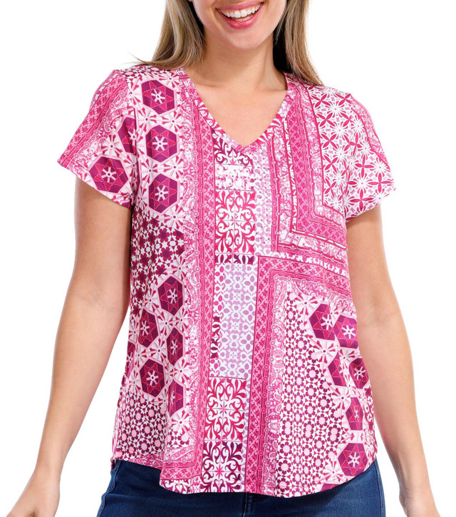 The Petite Printed Rhinestone V-Neck Short Sleeve Top combines elegance and style with a touch of sparkle. Made from a soft 95% polyester and 5% spandex blend, it offers a comfortable, stretchy fit. The V-neckline flatters the frame, while the printed design and rhinestone accents add a bit of glamour. Perfect for casual outings or dressing up, this top effortlessly blends comfort and chic style.