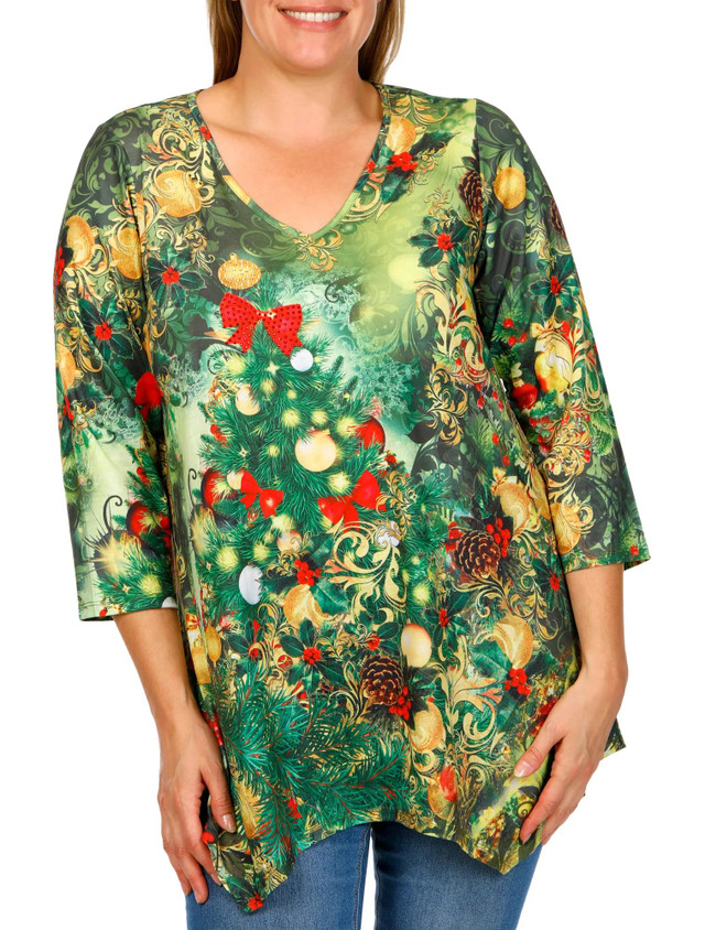 Celebrate the season in style with this plus-size Christmas tree top. Featuring a flattering v-neckline and 3/4 sleeves, it is adorned with a festive tree design that adds cheerful charm to your holiday wardrobe. Fabrication is 95% polyester, 5% spandex