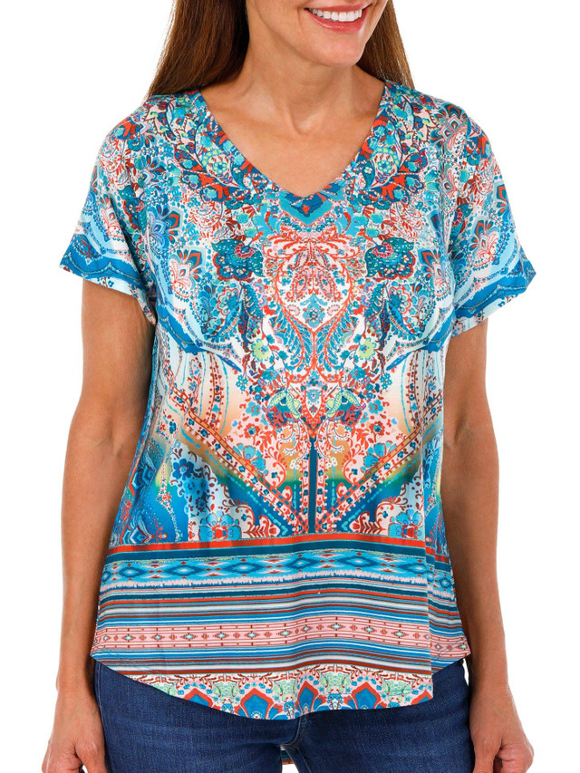 This women's boho floral top features a vibrant multicolored print with a flattering v neckline and short sleeves. Rhinestone accents add a touch of sparkle making it a stylish choice for both casual and dressy occasions. Fabrication 95% polyester, 5% spandex