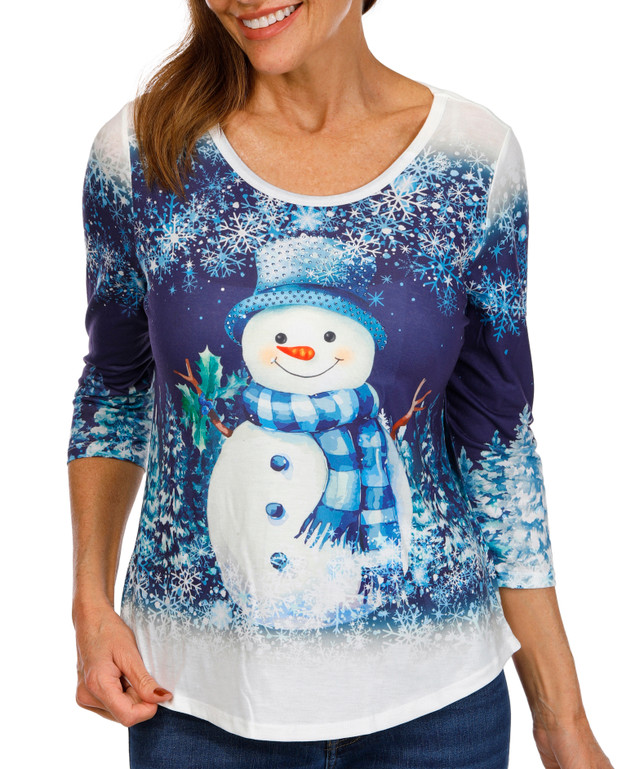 Add cheerful style to your winter wardrobe with the Womens 3/4 Sleeve Crew Neck Snowman Top, featuring a large snowman design on front surrounded by an allover snowflake graphic in shades of blues and white. The snowmans hat is accented with shiny metal studs for a festive finish. Perfect for seasonal gatherings or casual holiday wear. Fabrication is 95% polyester 5% spandex. Length measures approximately 24 in.