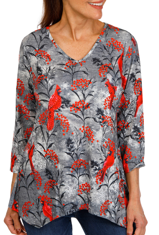 Embrace seasonal charm with the Womens 3/4 Sleeve V-Neck Cardinals Top, featuring an allover print of red cardinals perched on tree branches in tones of black grey and white. Select cardinals are embellished with shiny metal studs for added detail. Designed with a flattering V-neck and shark bite hem. Ideal for winter outings or festive occasions. Fabrication is 95% polyester 5% spandex. Length measures approximately 26 in.