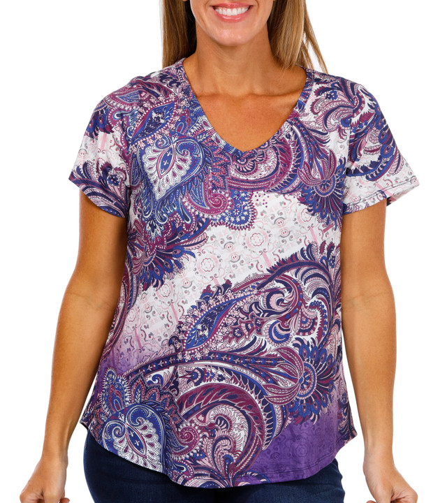 Turn heads in this embellished V-neck top with short sleeves that deliver effortless style. The stretch blend hugs just right while the lightweight fabric keeps you cool and confident. Designed to shine from day to night. Fabrication: 95% Polyester 5% Spandex This top is approximately 23 inches long.